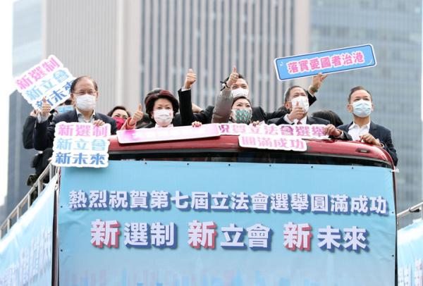 2021年12月23日,香港多個同鄉社團舉辦花車巡游,慶賀香港特區第七屆立法會選舉取得成功。新華社記者 李鋼 攝