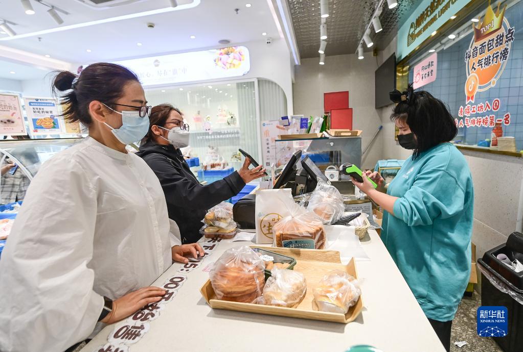 顧客在上海市松江區中山中路的一家面包店購物(5月10日攝)。