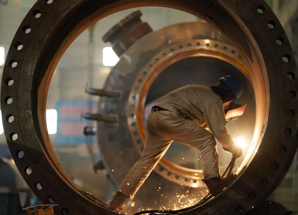 4月14日,在哈電集團(tuán)哈爾濱鍋爐廠有限責(zé)任公司車間,工人進(jìn)行生產(chǎn)作業(yè)。(新華社記者王建威攝)