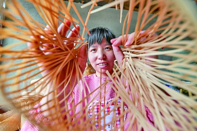 貴州省三穗縣八弓鎮界牌村,返鄉青年楊杜娟在制作竹編產品。新華社發