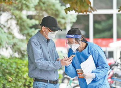 北京市朝陽區建外街道北郎社區一處核酸檢測點,志愿者邊萌(右)在協助一名檢測者掃碼登記。 新華社記者 鞠煥宗攝