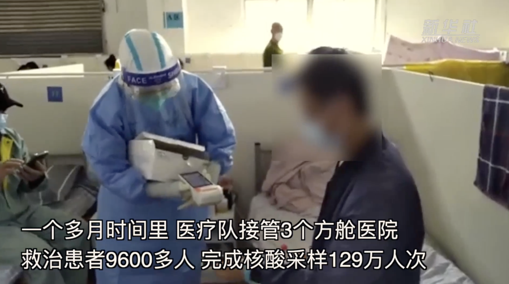 一個(gè)多月時(shí)間里,醫(yī)療隊(duì)接管3個(gè)方艙醫(yī)院,救治患者9600多人,完成核酸采樣129萬(wàn)人次。