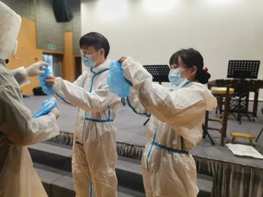 在得知劇院院址的核酸檢測點需要志愿者的消息后,劇院群里被“可以馬上到崗!”的消息刷屏。志愿者團隊在不到一天內集結完成,他們中有臨近退休的老職工,也有樂于奉獻的青年演員,大家換上了“大白”“小藍”服裝,協助工作人員做好物料準備、檢測掃碼工作。青年演員還發揮特長,用滬語播報檢測流程,為居民耐心解答核酸登記問題。錢瑩表示,“戰‘疫’是一面鏡子,照見了尋常日子里不易看到的忠誠和擔當。在防疫一線學習到更多知識、收獲更多經驗、感受更多冷暖,更加體會到防疫一線工作人員們的艱辛和不易。堅持就是勝利,讓我們肩并肩在愛中同行,重逢于抗疫之戰取得勝利的上海!”