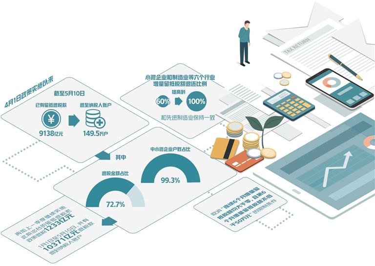 今年增值稅留抵退稅規(guī)模約1.5萬(wàn)億元。4月1日政策實(shí)施以來(lái),截至5月10日,已有9138億元留抵退稅款退至149.5萬(wàn)戶納稅人賬戶。其中,中小微企業(yè)戶數(shù)占比99.3%,退稅金額占比72.7%,再加上一季度繼續(xù)實(shí)施此前出臺(tái)的留抵退稅老政策退稅1233億元,1月1日至5月10日,共有10371億元退稅款退到納稅人賬戶,為企業(yè)紓困解難、提振市場(chǎng)主體信心發(fā)揮了重要作用。