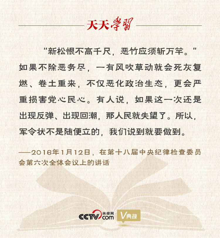 反對腐敗、建設(shè)廉潔政治,保持黨的肌體健康,始終是我們黨一貫堅持的鮮明政治立場。黨風廉政建設(shè),是廣大干部群眾始終關(guān)注的重大政治問題。2016年,在十八屆中央紀委六次全會上,習近平總書記引用杜甫的“新松恨不高千尺,惡竹應須斬萬竿”詩句,表明了黨中央對黨風廉政建設(shè)和反腐敗斗爭的高度重視和堅定決心。他要求持之以恒糾正“四風”,要咬住“!薄伴L”二字,經(jīng)常抓、深入抓、持久抓。除惡務盡,決不允許出現(xiàn)反彈、回潮。