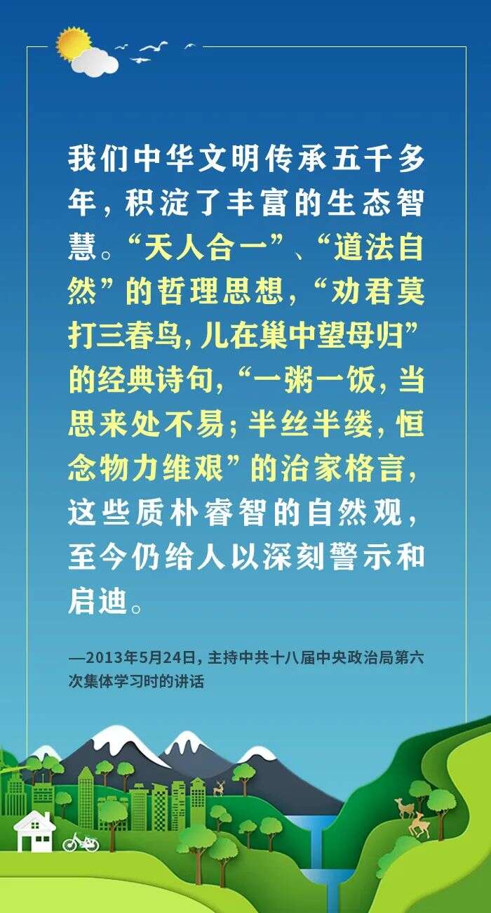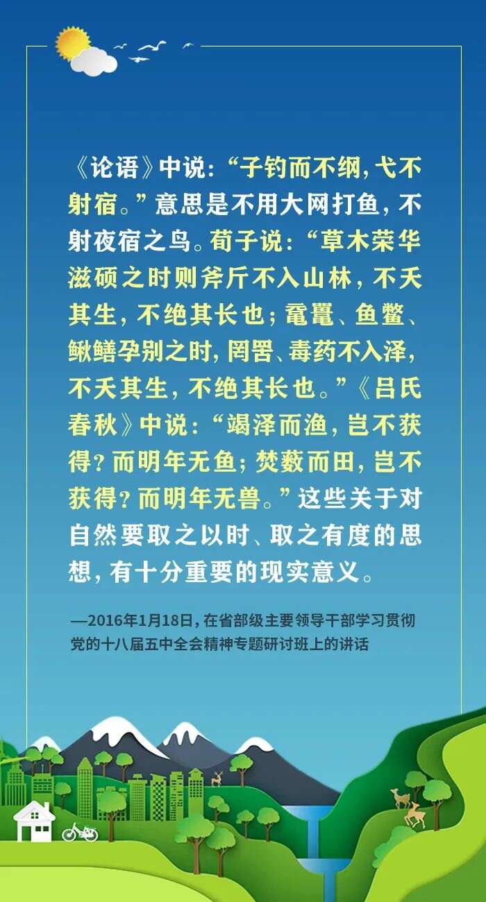 編者按:黨的十八大以來,習近平總書記傳承中華民族傳統文化、順應時代潮流和人民意愿,站在堅持和發展中國特色社會主義、實現中華民族偉大復興中國夢的戰略高度,圍繞生態文明建設發表一系列重要論述,深刻回答了為什么建設生態文明、建設什么樣的生態文明、怎樣建設生態文明等重大理論和實踐問題,形成了習近平生態文明思想。習近平總書記在一系列重要論述中,精妙運用古代典籍、經典名句,以古喻今、啟迪思想、激蕩精神。一起來學習!
