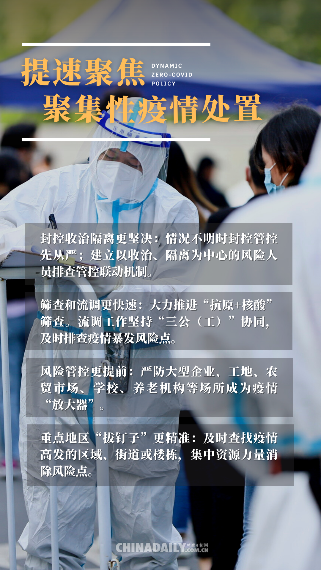 近日,我國新增本土確診病例和無癥狀感染者繼續下降,但有的地方本土傳播尚未完全阻斷,疫情防控形勢依然嚴峻復雜。奧密克戎變異株傳染性強,無癥狀感染者多,對防控工作和措施提出了更高的要求,需更加突出“科學精準、動態清零”,并通過完善防控體系,優化防控措施等舉措,努力以最小范圍、最短時間、最低代價控制住突發疫情,堅決筑牢疫情防控屏障。