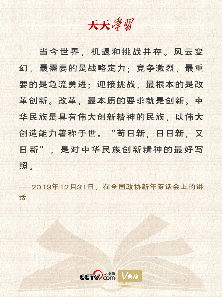 每逢重要場(chǎng)合,習(xí)近平總書記都要談改革、談創(chuàng)新。他曾多次引用“茍日新,日日新,又日新”這句古語(yǔ),強(qiáng)調(diào)創(chuàng)新是民族進(jìn)步的靈魂,是一個(gè)國(guó)家興旺發(fā)達(dá)的不竭源泉,也是中華民族最深沉的民族稟賦。生活從不眷顧因循守舊、滿足現(xiàn)狀者,從不等待不思進(jìn)取、坐享其成者,而是將更多機(jī)遇留給善于和勇于創(chuàng)新的人們。在黨的十八屆五中全會(huì)上,習(xí)近平總書記提出“創(chuàng)新、協(xié)調(diào)、綠色、開放、共享”新發(fā)展理念,其中“創(chuàng)新”居于五大發(fā)展理念之首。