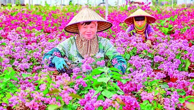 在臨高縣花卉產業觀光園內,一簇簇三角梅生長旺盛,村民們正在修剪花枝,打理園區。陳元才攝/光明圖片