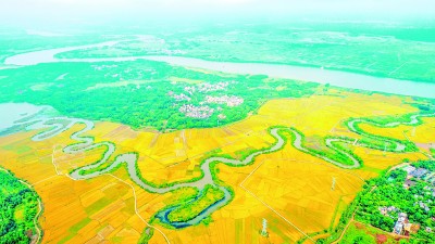 立夏時節,海口市瓊山區云龍鎮三十六曲溪濕地公園早稻成熟,蜿蜒曲折的河道與金黃的稻田交織成一幅美麗的圖畫。石中華攝/光明圖片