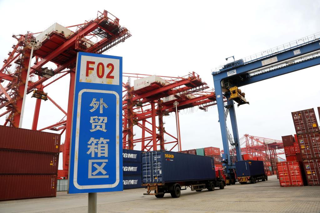 5月9日,在江蘇省連云港港集裝箱碼頭,運輸車輛向貨輪轉運集裝箱。新華社發(王春攝)