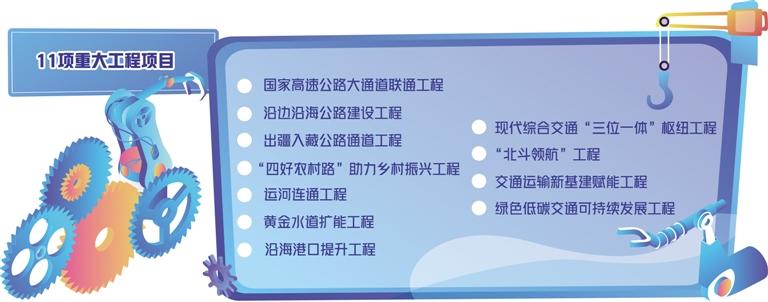 重大工程項目包涉及國家高速公路大通道聯(lián)通工程、沿邊沿海公路建設(shè)工程、出疆入藏公路通道工程、“四好農(nóng)村路”助力鄉(xiāng)村振興工程、運河連通工程、黃金水道擴能工程、沿海港口提升工程、現(xiàn)代綜合交通“三位一體”樞紐工程、“北斗領(lǐng)航”工程、交通運輸新基建賦能工程、綠色低碳交通可持續(xù)發(fā)展工程11項。