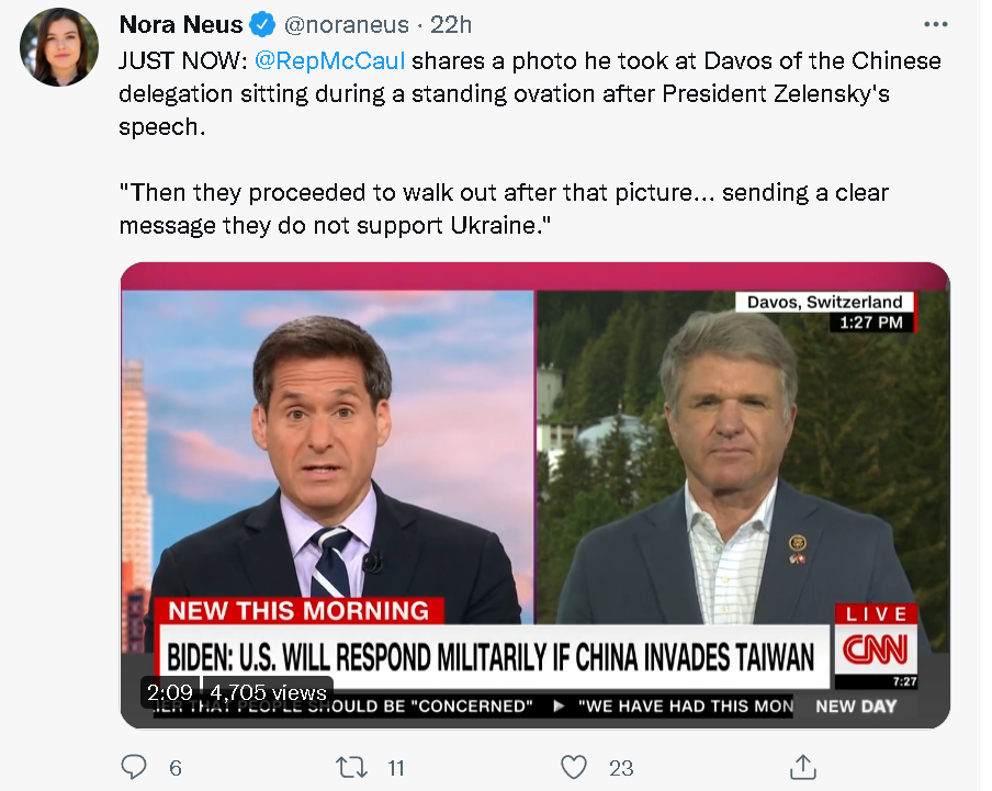 最初幫麥考爾傳播謠言的CNN主播伯曼,以及他的制片人、CNN記者諾拉·紐斯(Nora Neus),也仍然在他們的社交賬號上幫麥考爾擴散著所謂的“中國代表團不給烏克蘭總統鼓掌”的說法。
