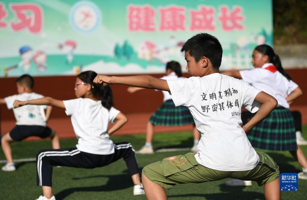 在陜西省安康市平利縣老縣鎮中心小學的操場上,學生們在課后參加武術社團活動(2020年9月7日攝)。新華社記者 李一博 攝