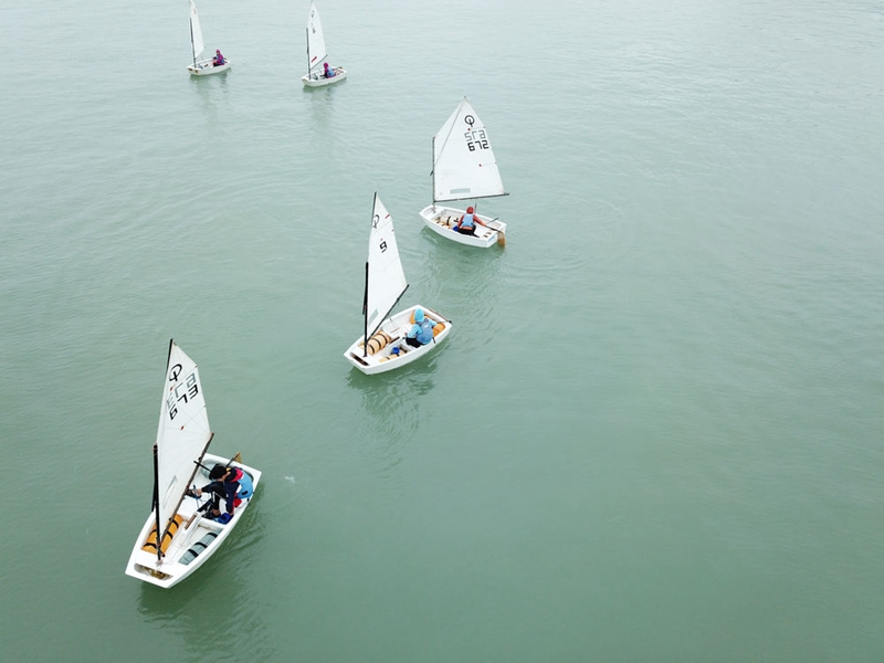 ↑2019年4月20日,浙江省臺州市椒江區少體校大陳帆船帆板基地的孩子們在海上訓練(無人機照片)。