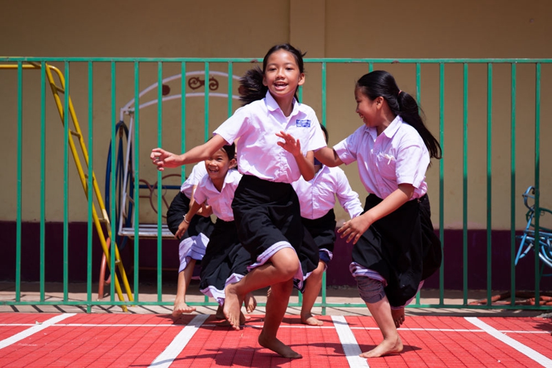 ↑2022年5月10日,孩子們在老撾中老友好農冰村小學開展體育活動。