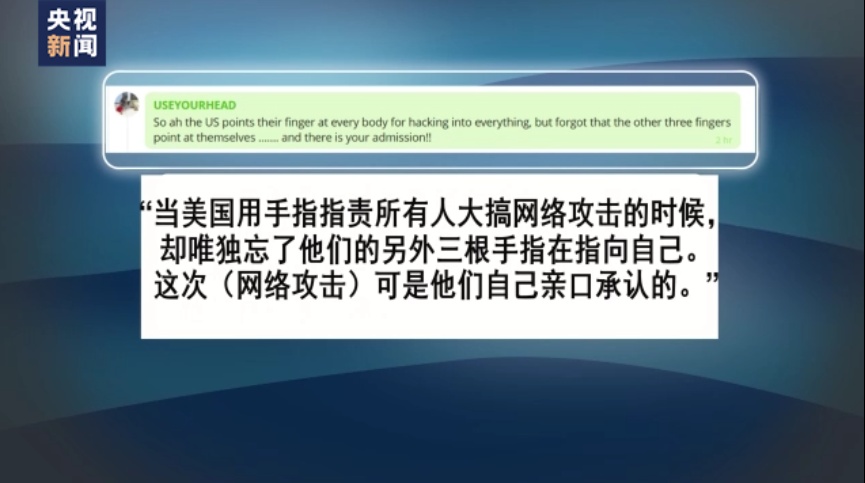 “當美國用手指指責所有人大搞網絡攻擊的時候,卻唯獨忘了他們的另外三根手指在指向自己。這次(網絡攻擊)可是他們自己親口承認的!
