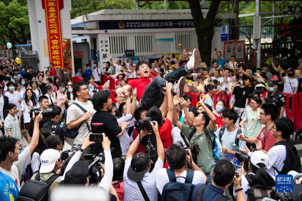 6月9日,在湖南省長沙市一中考點(diǎn)外,學(xué)生拋起老師慶祝高考結(jié)束。