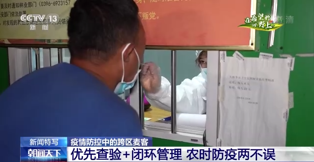 晚上10點(diǎn)多,來自黑龍江佳木斯的機(jī)手孔德寶和老鄉(xiāng)田佰良,在完成信陽息縣的收割后,拉著兩臺(tái)收割機(jī)趕到了上蔡縣,要按一位用戶發(fā)來的定位去往麥?zhǔn)盏攸c(diǎn)。駐馬店上蔡縣是河南的種糧大縣,小麥種植面積146萬畝。6月1日前后,上蔡縣的小麥進(jìn)入大面積的收割時(shí)段,3000多臺(tái)跨區(qū)作業(yè)的收割機(jī)云集上蔡參加搶收。持有跨區(qū)作業(yè)證的孔德寶和老鄉(xiāng)田佰良,在農(nóng)機(jī)轉(zhuǎn)運(yùn)綠色通道服務(wù)站點(diǎn),接受免費(fèi)落地核酸檢測。