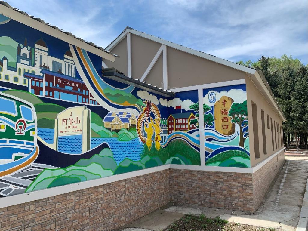 在西口村黨群服務中心,幾十面墻壁滿是各色墻繪,艷麗而靈動,灰頭土臉的老房子一下“活”了起來。這些作品都是近幾年創作的。尤其在2021年,西口村舉行了第一屆阿爾山市鄉村墻繪藝術大賽,上海大學上海美術學院、浙江藝術職業學院、廣州美術學院附中等8所院校,近千人次來到西口村,長達數月進行墻繪創作,總創作面積超1000平方米。