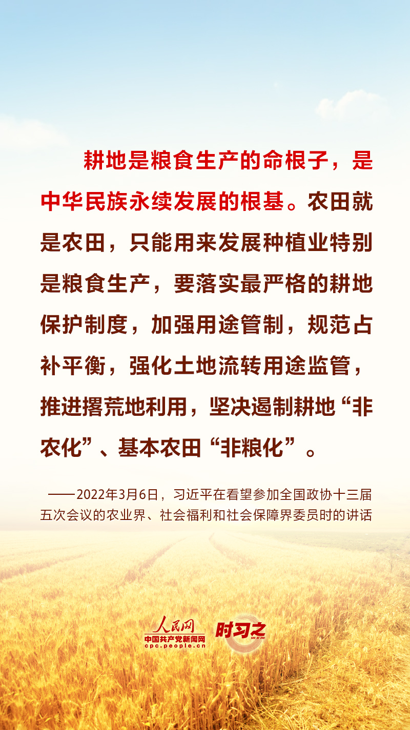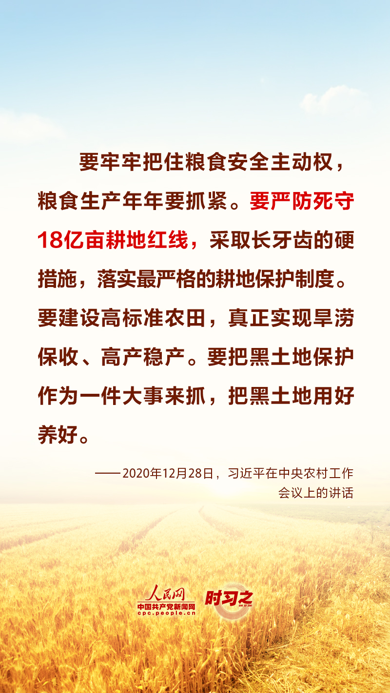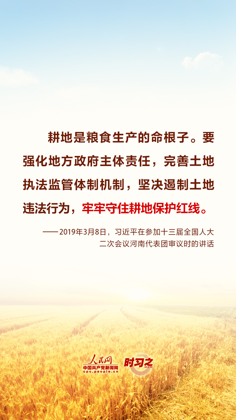 “民非谷不食,谷非地不生。”糧食安全在習(xí)近平總書記心中有著特殊的分量,他多次深入田間地頭察墑情、看苗情、問收成,明確指出“耕地是糧食生產(chǎn)的命根子”。耕地是我國最為寶貴的資源,堅持藏糧于地、端穩(wěn)中國飯碗,“希望的田野”終將麥浪滾滾、稻花飄香。