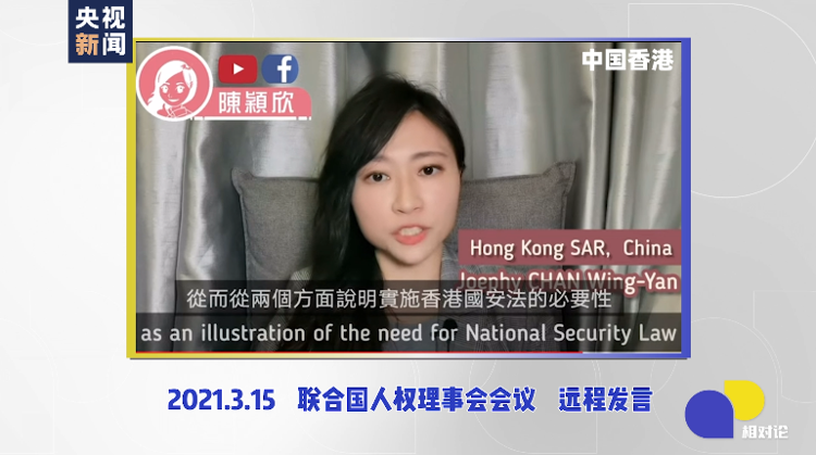 2021年3月15日,聯(lián)合國人權(quán)理事會會議——90秒,是陳穎欣的發(fā)言時間,主題是2020年6月30日落地生效的香港國安法。
