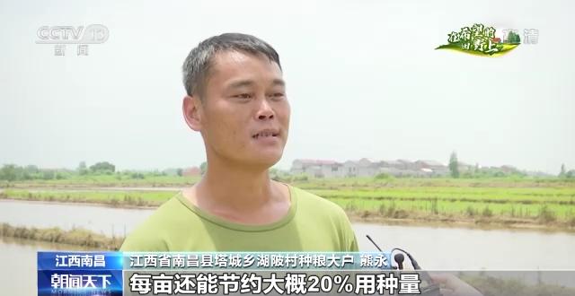 江西省南昌縣塔城鄉(xiāng)湖陂村種糧大戶 熊永:種子撒得均勻,每畝還能節(jié)約大概20%用種量,人工播種的話每天只能完成30畝地左右,使用無人機一天可以完成400多畝的播種,效率是人工工作的十倍。