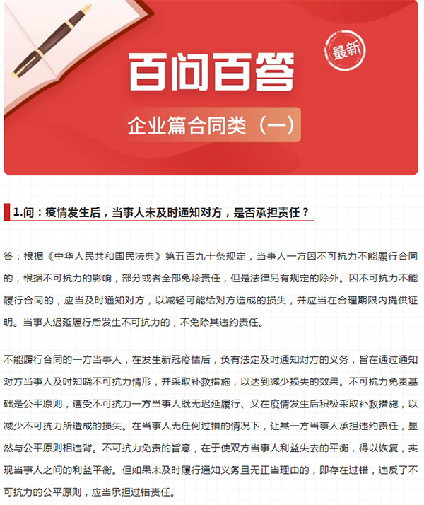 記者從北京市房山區(qū)司法局獲悉,在復(fù)工復(fù)產(chǎn)有序推進(jìn)的形勢(shì)下,房山區(qū)司法局推出《房山區(qū)疫情防控期間涉停工矛盾糾紛法律指引》,以“百問(wèn)百答”的形式,從企業(yè)、個(gè)人兩個(gè)視角,針對(duì)廣大人民群眾關(guān)心、關(guān)注的疫情期間有關(guān)停工停產(chǎn)、復(fù)工復(fù)產(chǎn)方面的社會(huì)熱點(diǎn)、焦點(diǎn)、難點(diǎn)問(wèn)題,結(jié)合各職能部門行業(yè)管理實(shí)際,從分析解讀法律關(guān)系、適用法律的角度為社會(huì)大眾合理解決訴求提供參考。