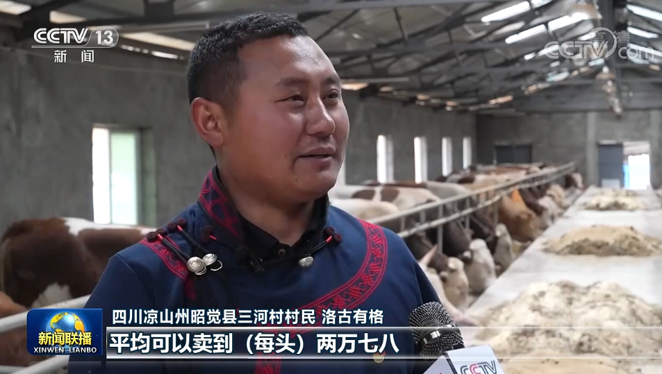 四川涼山州昭覺縣三河村村民 洛古有格:當時總書記來的時候,我們這個養(yǎng)牛只有十幾頭。通過發(fā)展,我們三河村有了1000多頭這個西門塔爾牛。現(xiàn)在我們這個牛,平均可以賣到(每頭)兩萬七八,大的可以賣到三萬多元,效益特別好。