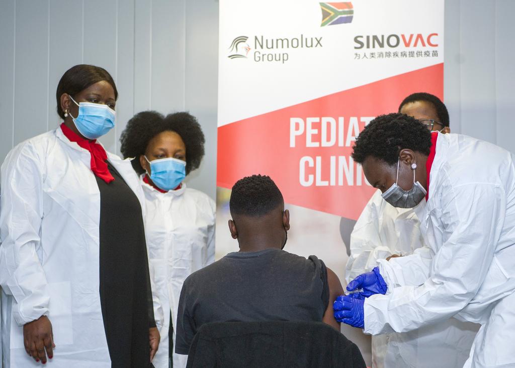 2021年9月10日,在南非比勒陀利亞,醫(yī)務人員給首名青少年志愿者注射第一劑科興疫苗。新華社記者 陳誠 攝
