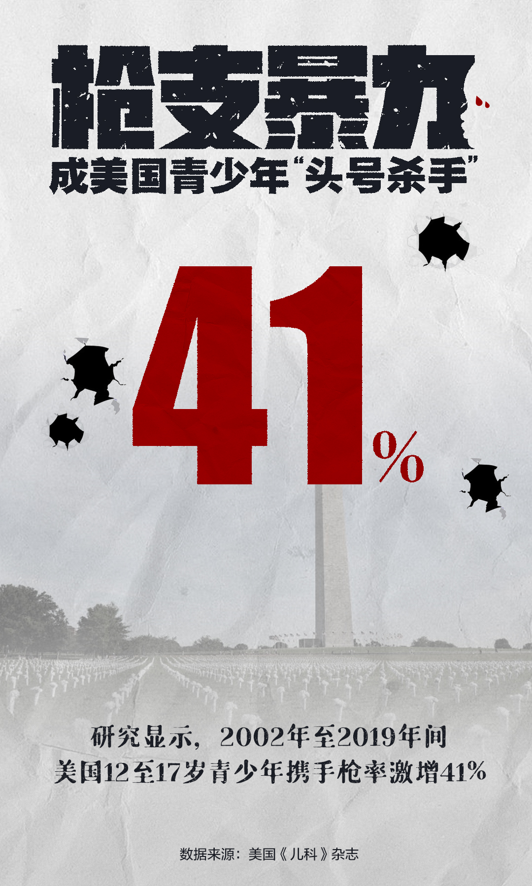 美國槍支泛濫,同時槍支文化根深蒂固,“以槍制槍、以暴制暴”等擁槍觀點盛行,一些家長竟試圖通過鼓勵孩子持槍來保護他們免受槍擊。美國《兒科》雜志2022年4月刊登的一項研究報告顯示,2002年至2019年間,美國12至17歲青少年攜槍率激增41%。