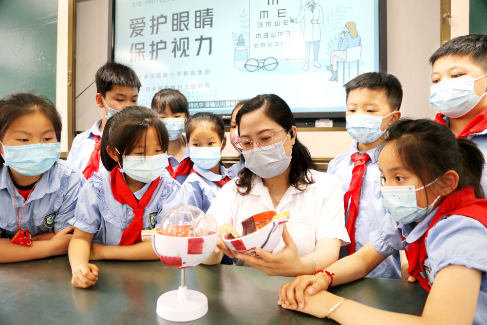 ↑在江蘇省連云港市院前小學,校醫為學生講解保護眼睛的常識(2022年6月6日攝)。