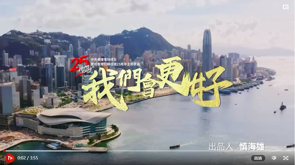 “我們還記得,香港政權交接時,中華人民共和國國歌雄壯奏響、中華人民共和國國旗和香港特別行政區區旗冉冉升起的神圣莊嚴。我們還記得,中國人民解放軍駐港部隊進駐時,香港同胞冒著瓢潑大雨熱烈歡迎的興奮激動。我們還記得,在喜迎回歸的日子里,神州大地張燈結彩,男女老少載歌載舞,舉國同慶的幸福歡樂。”