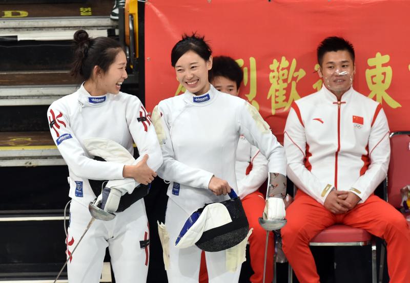 2021年12月4日,內地奧運健兒代表團訪港一行進入第二天的活動。中國擊劍選手孫一文(前右)與中國香港擊劍選手江旻憓(前左)在活動中交談。新華社記者盧炳輝攝