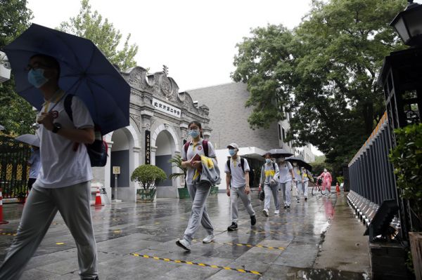 6月27日,北京二中學(xué)生在出示健康碼、接受體溫檢測(cè)后按照指定通道進(jìn)入校園。(新華社發(fā))