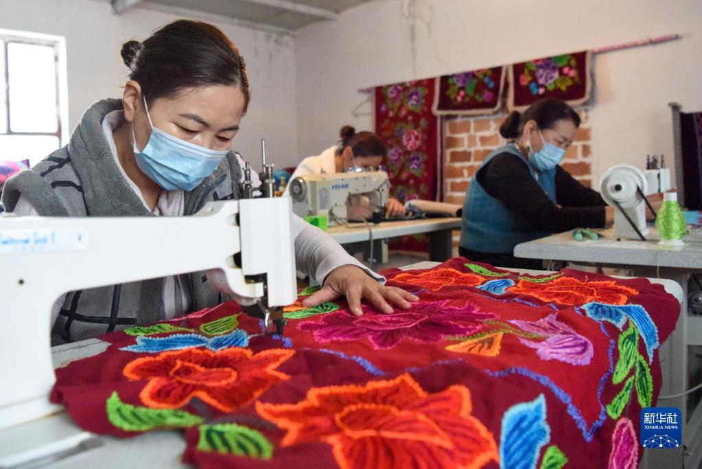 在新疆吉木薩爾縣白泉村刺繡專業合作社,繡娘在制作哈薩克族刺繡(2021年1月23日攝)。新華社記者 丁磊 攝