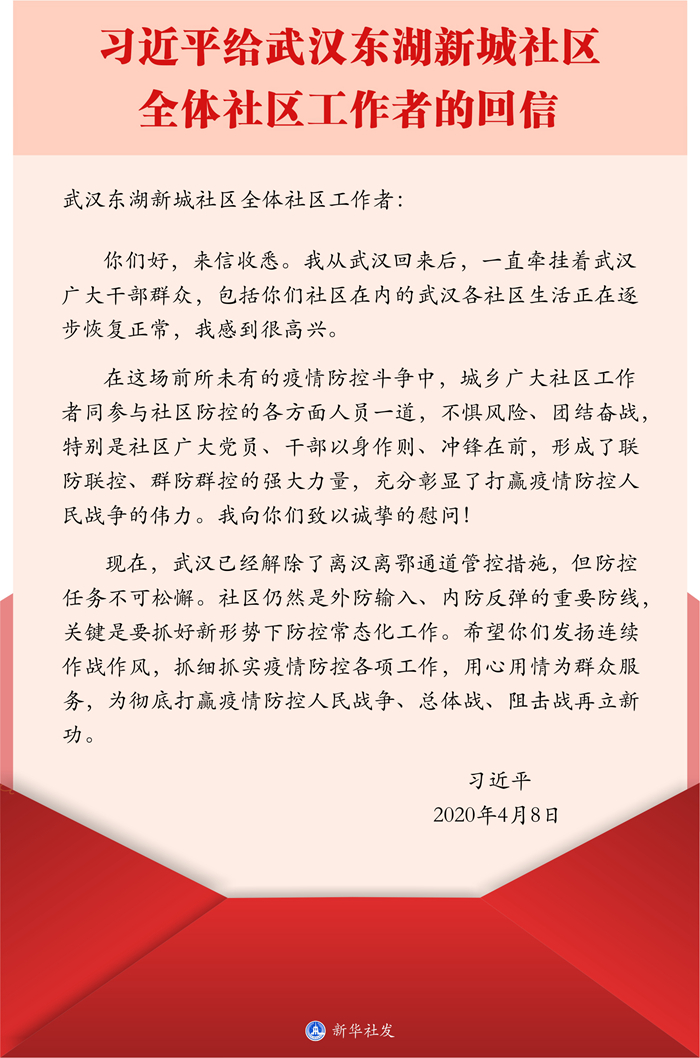 2020年,武漢市東湖新城社區(qū)的全體社區(qū)工作者給習(xí)近平總書記寫信,表達(dá)了對(duì)習(xí)近平總書記和黨中央的感激之情,以及繼續(xù)堅(jiān)守好陣地、履行好職責(zé)的堅(jiān)強(qiáng)決心。