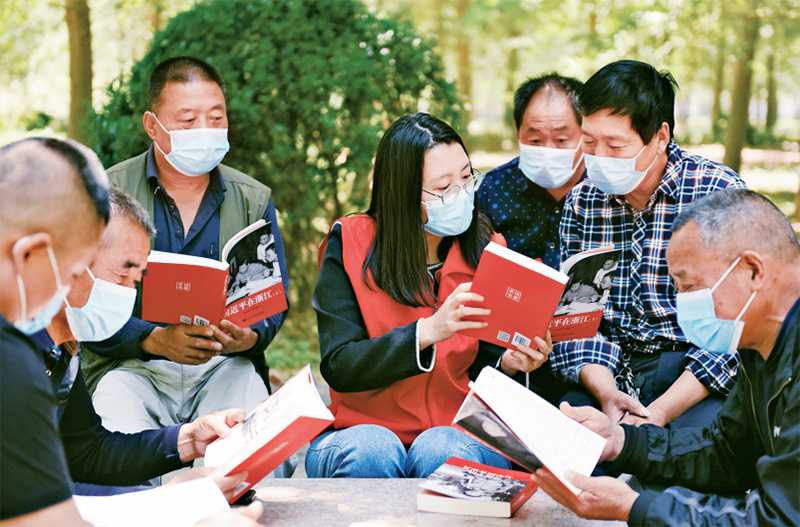2022年5月16日,山東省臨沂市郯城縣“學理論宣講團”成員走進馬頭鎮民主街“農家花園”,開展“講故事,學理論”宣講活動。 求是圖片 房德華/攝