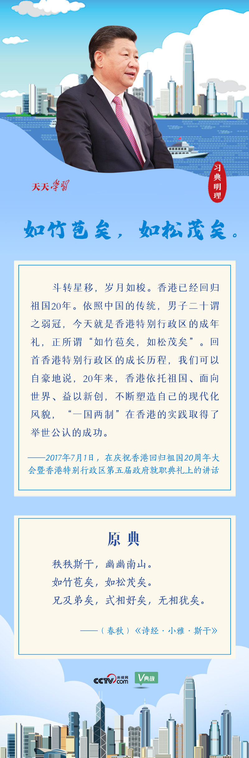 站在經(jīng)過歲月洗禮發(fā)生滄桑巨變的香江之濱,習(xí)主席撫今追昔,感慨萬千,借用《詩經(jīng)》中富有特殊含義的“如竹苞矣,如松茂矣”,形容香港回歸祖國后繁榮發(fā)展的前景。