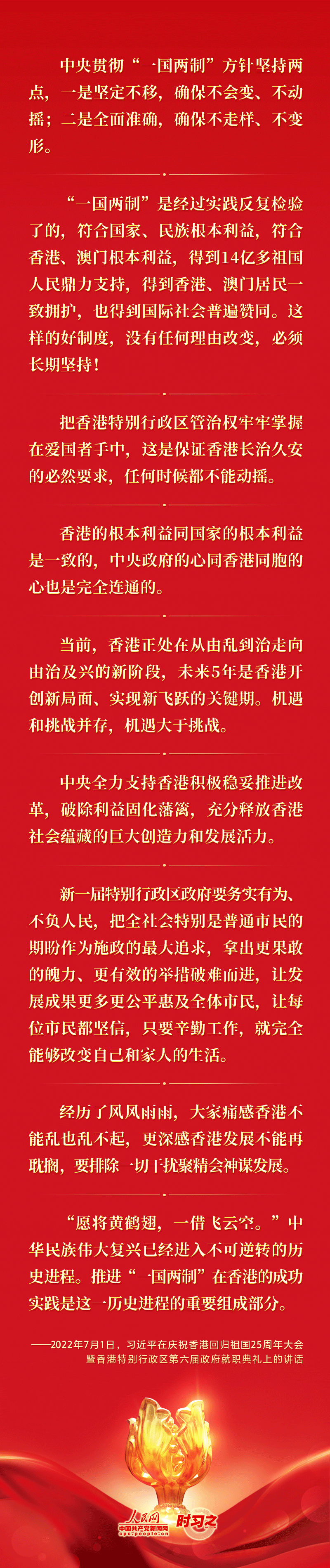 紫荊花開正爛漫,踔厲奮發啟新程。2022年7月1日上午,中共中央總書記、國家主席、中央軍委主席習近平在慶祝香港回歸祖國25周年大會暨香港特別行政區第六屆政府就職典禮上發表重要講話。習近平指出,“一國兩制”在香港的豐富實踐給我們留下很多寶貴經驗,也留下不少深刻啟示。25年的實踐告訴我們,只有深刻理解和準確把握“一國兩制”的實踐規律,才能確保“一國兩制”事業始終朝著正確的方向行穩致遠。