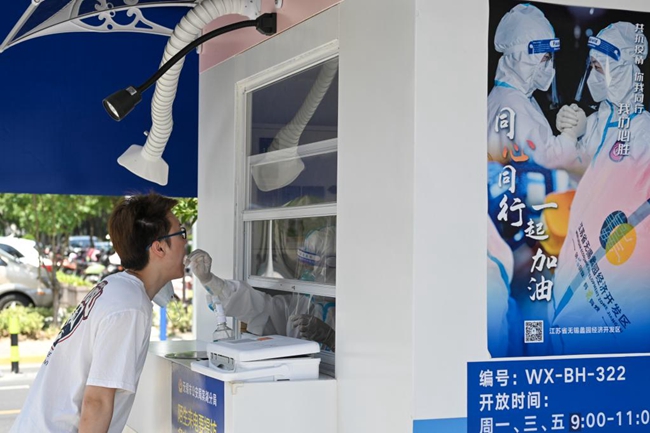 7月5日,在無錫市濱湖區(qū)蠡園街道的一處核酸采樣點(diǎn),一名市民在進(jìn)行核酸采樣。