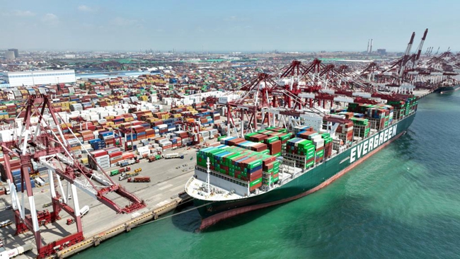 6月15日,山東港口青島港前灣港區(qū),集裝箱貨輪在碼頭裝卸集裝箱。