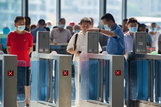7月1日,在株洲火車站安檢區(qū),旅客進(jìn)行人臉識(shí)別通過安檢。