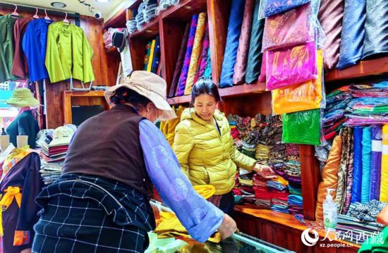 進入旅游旺季后,來自天南地北的游客到拉薩八廓古城賞民俗品文化,位于八廓街上的朵究倉藏裝店也因此成了必備網紅打卡店。“我在新聞里看到總書記來過你們店,所以專門過來的,想買一身藏裝作紀念,老板你幫我看看哪件合適?”來自東北的吳女士邊挑選衣服邊說。