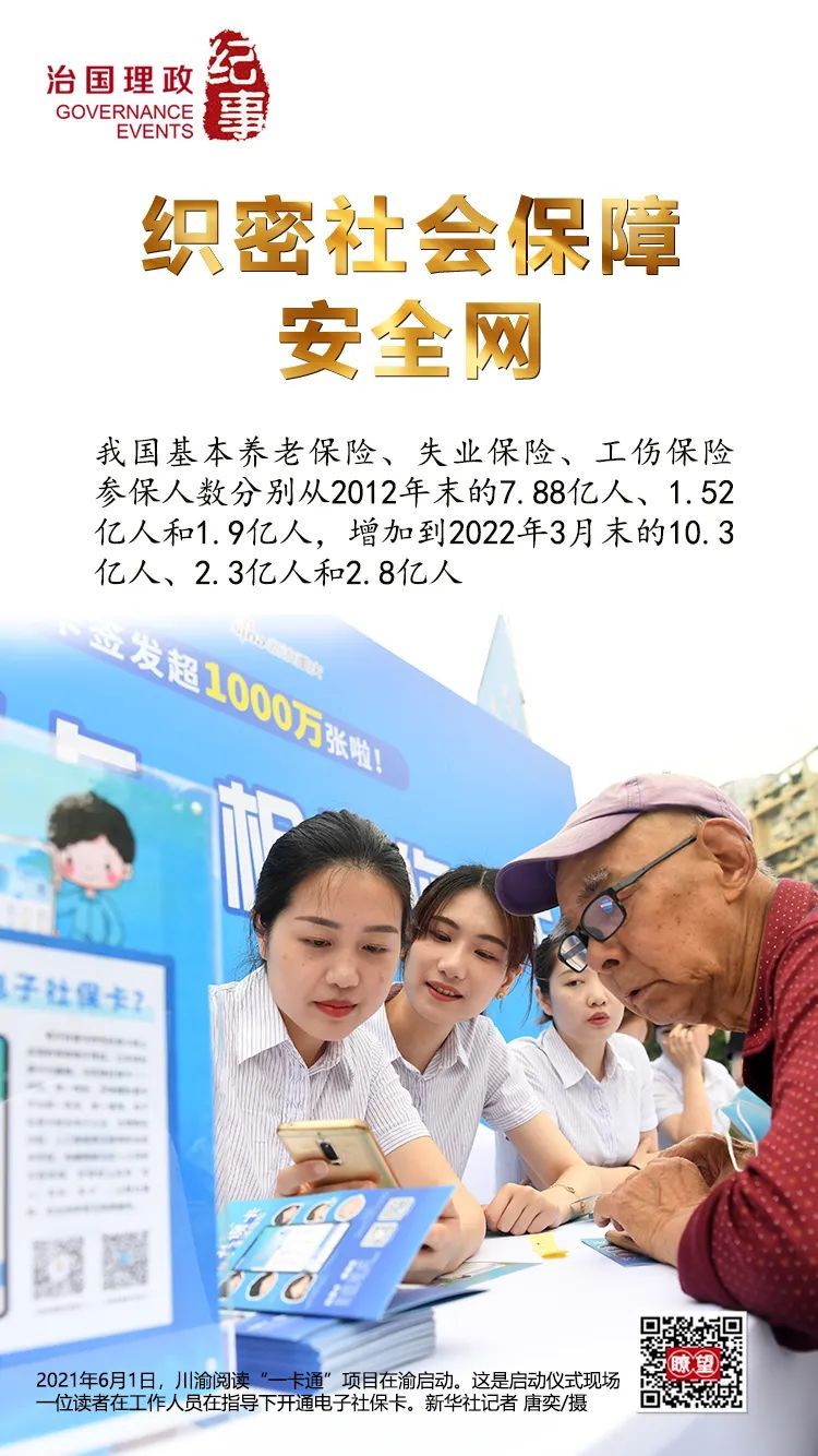 我國基本養老保險、失業保險、工傷保險參保人數分別從2012年末的7.88億人、1.52億人和1.9億人,增加到2022年3月末的10.3億人、2.3億人和2.8億人。近1億貧困人口實現基本醫療有保障,6098萬建檔立卡貧困人口參加基本養老保險,參保率穩定在99.99%以上,基本實現應保盡保。