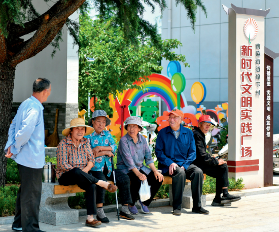 2022年6月15日,山東省沂源縣南麻街道埠下村村民在民生綜合體活動廣場休息。自2021年以來,沂源縣建設多處以老年食堂、公共浴室、中心村衛生室(便民藥店)、便民超市為主體,其他服務功能相補充的多位一體民生綜合體 朱崢攝/本刊