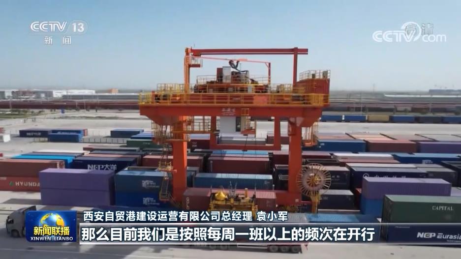 西安自貿(mào)港建設(shè)運(yùn)營有限公司總經(jīng)理 袁小軍:西安經(jīng)過里海和黑海到歐洲去的跨兩海的新線路,目前我們是按照每周一班以上的頻次在開行,基本上滿足了陜西及周邊地區(qū)企業(yè)對于到歐洲通道的需求。