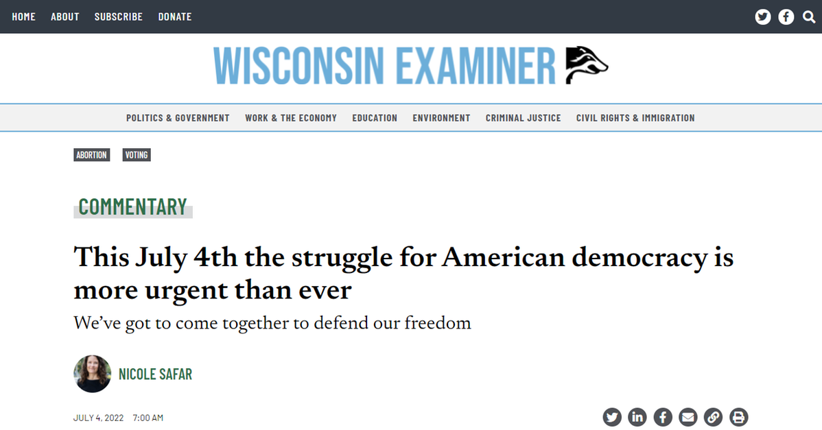 薩法爾表示,美國的民主制度受到政治不平等的破壞,而美國人面臨著保持這種狀態的協調努力。“想想看,美國憲法和1849年威斯康星州禁止墮胎的法律都是由白人男性起草的,他們認為侵占他人財產是可以接受的。為了白人的經濟利益,非洲人和土著人民被奴役,這些人的妻子和女兒被視為資產,生產力和生育能力都被控制。” 薩法爾寫道,他們所建立的民主制度是建立在政治不平等的基礎之上的,目的是鞏固白人對那些他們認為地位較低的社會成員的權力。