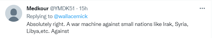 10日,華萊士以同樣的視頻配上不同的文字發了兩條推文,配文是他在視頻中講話的節選。“北約不是一個防御聯盟,而是一臺戰爭機器,”華萊士說,“去問問阿富汗、伊拉克和利比亞人民就知道了。北約的真正目的是捍衛正在衰落的美國霸權以及一個單極世界體系,北約為此而存在。”