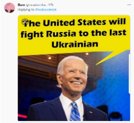另有網友發了一張圖,上面有美國總統拜登的形象,配文是“美國將與俄羅斯戰斗到只剩最后一個烏克蘭人”。↓